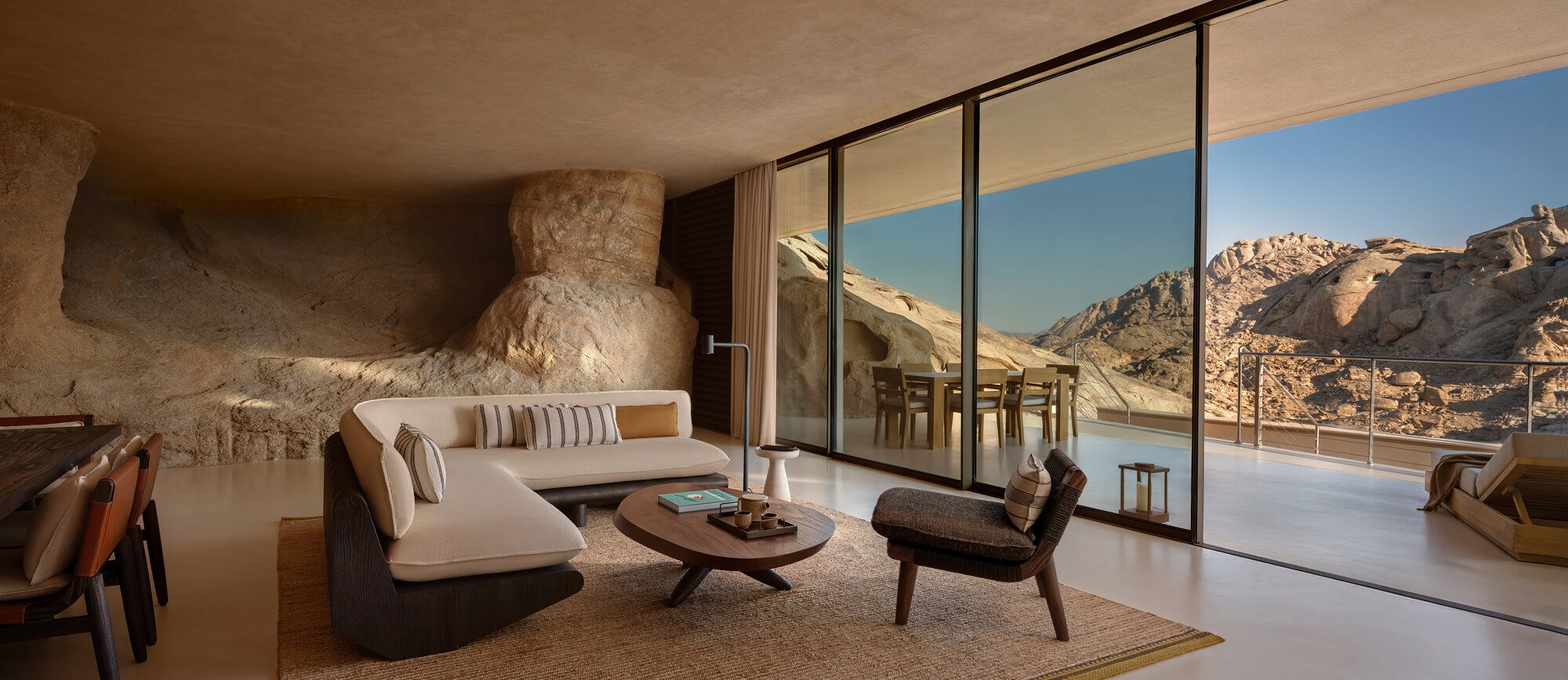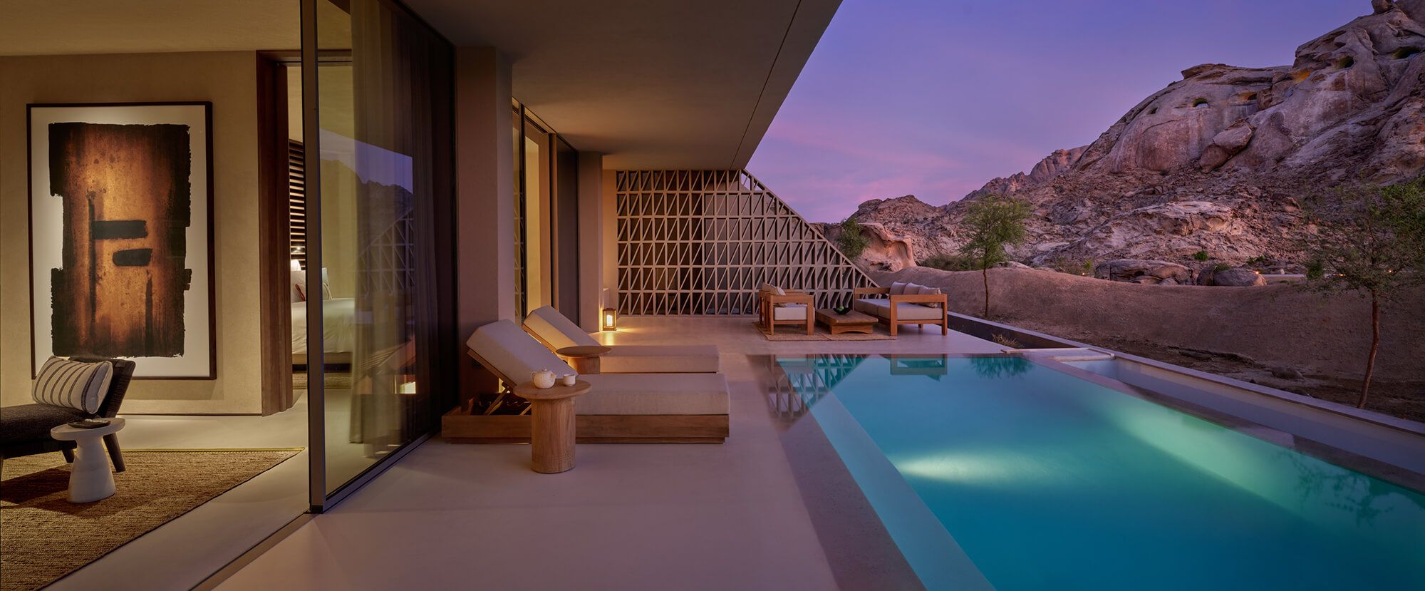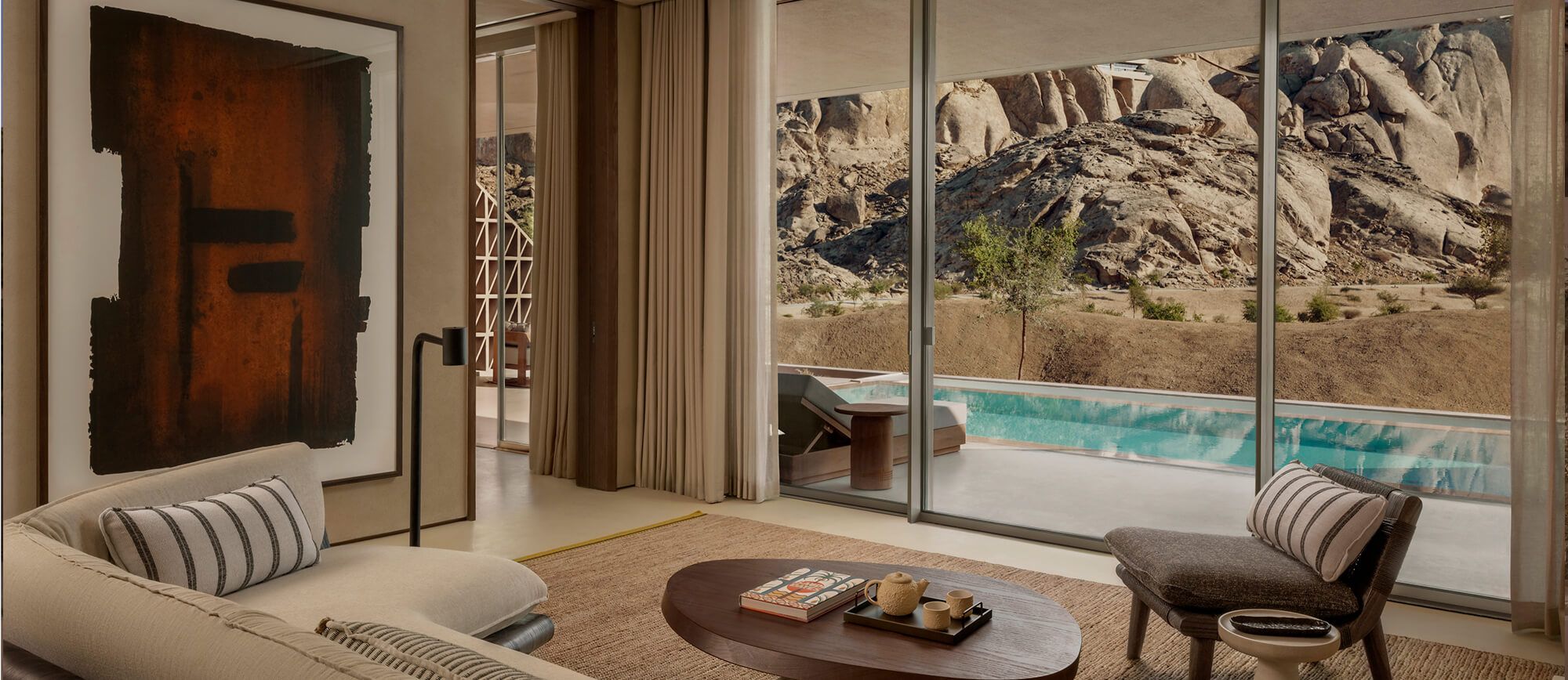 プライベートプールにゆとりあるリビング、そして砂漠の自然から着想を得た温もりあるデザインが、非日常の安らぎを演出。