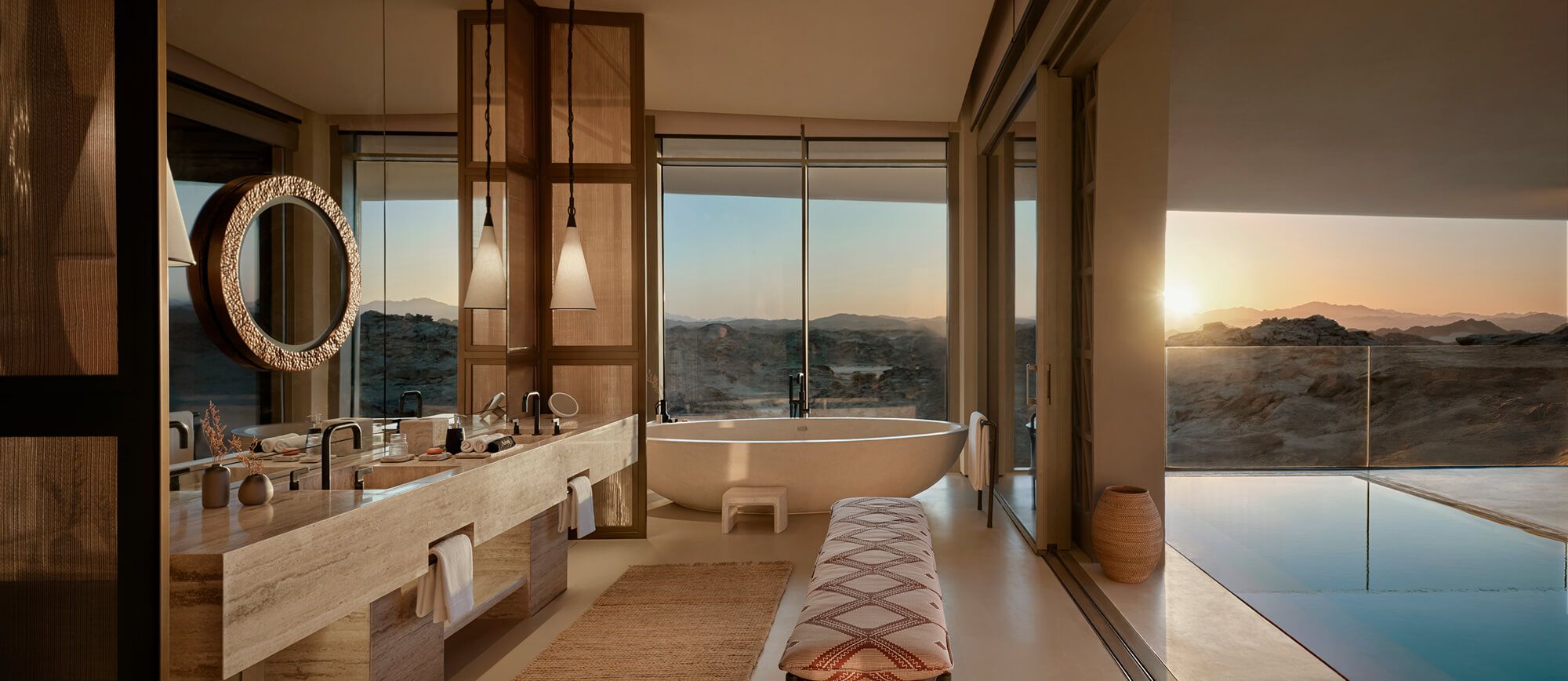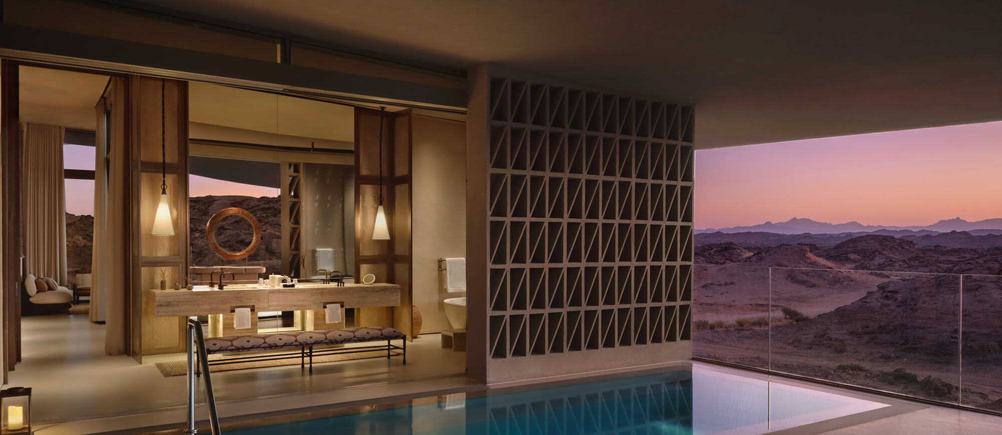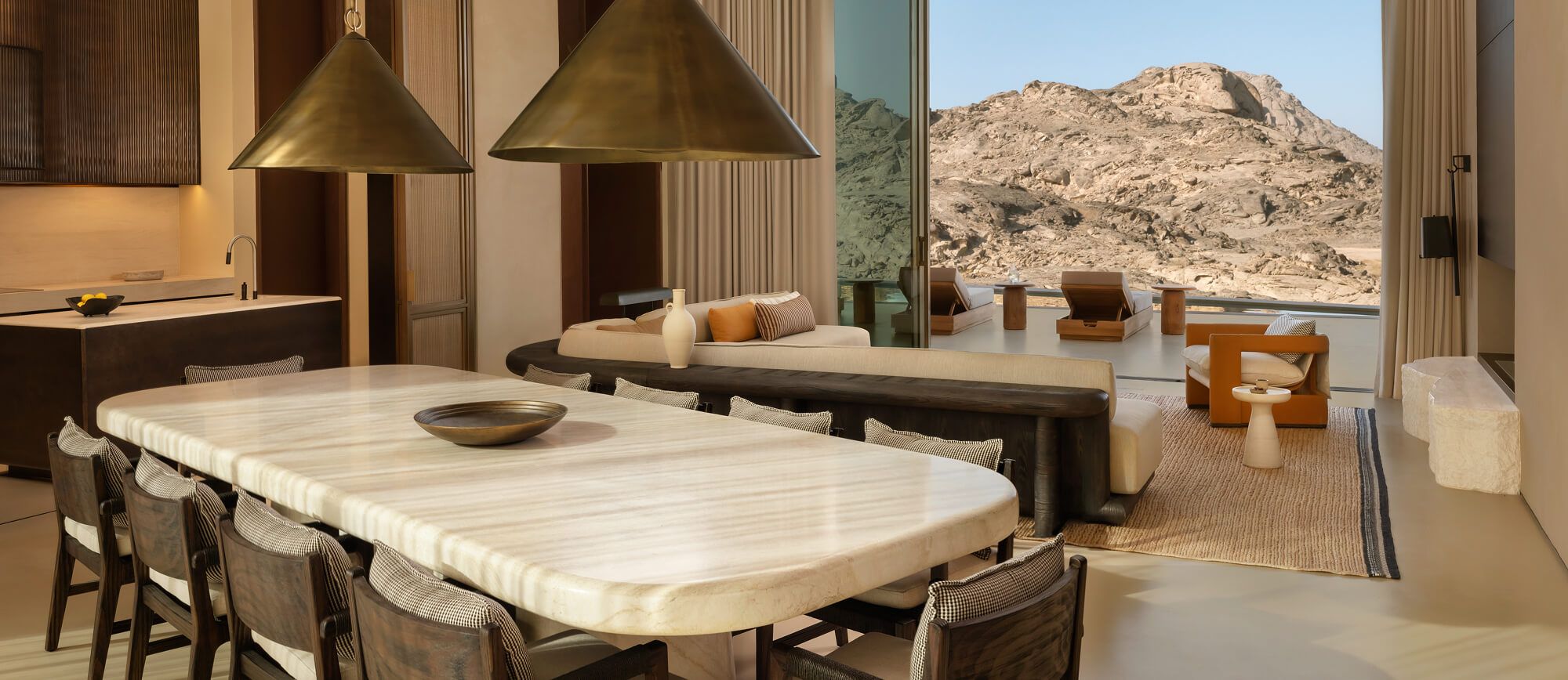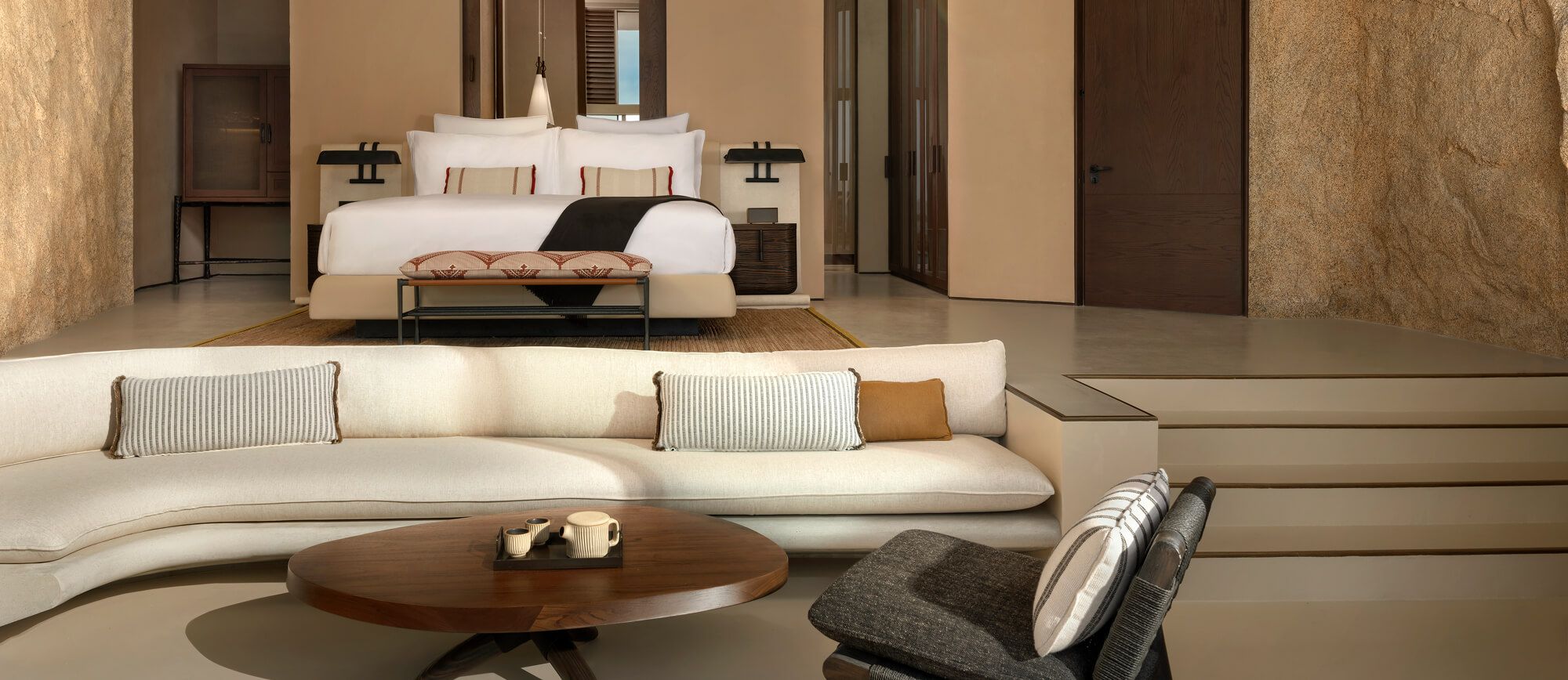 プライベートプールにゆとりあるリビング、そして砂漠の自然から着想を得た温もりあるデザインが、非日常の安らぎを演出。