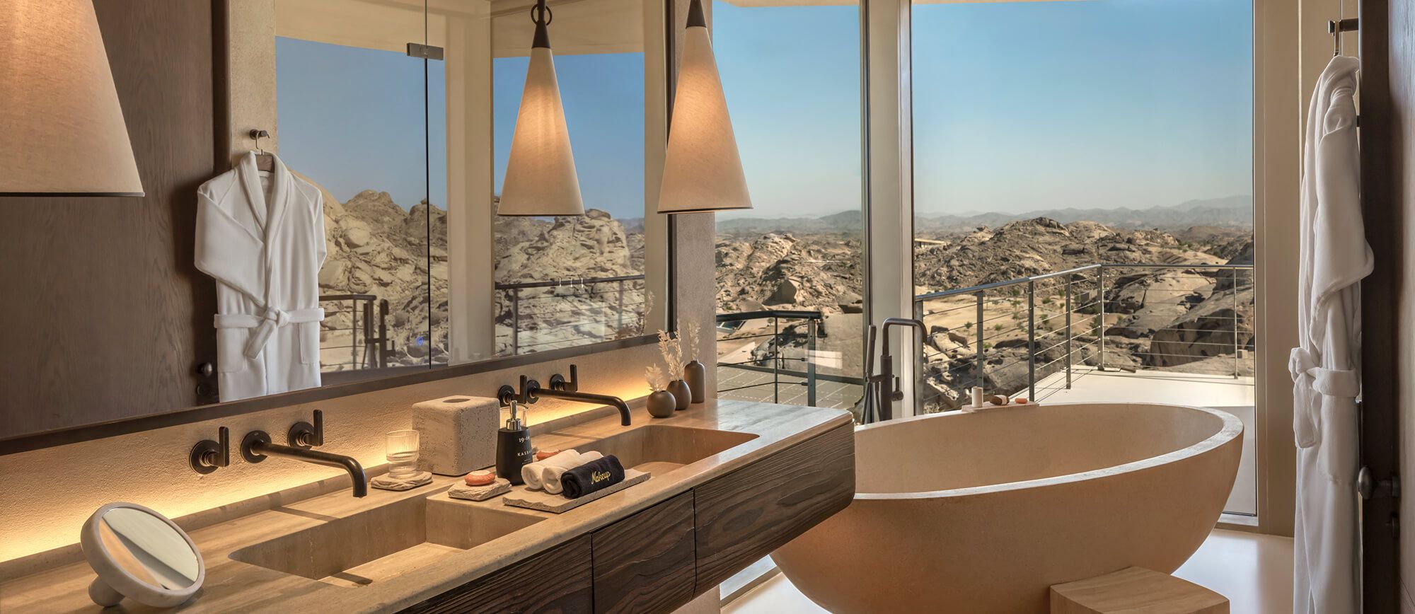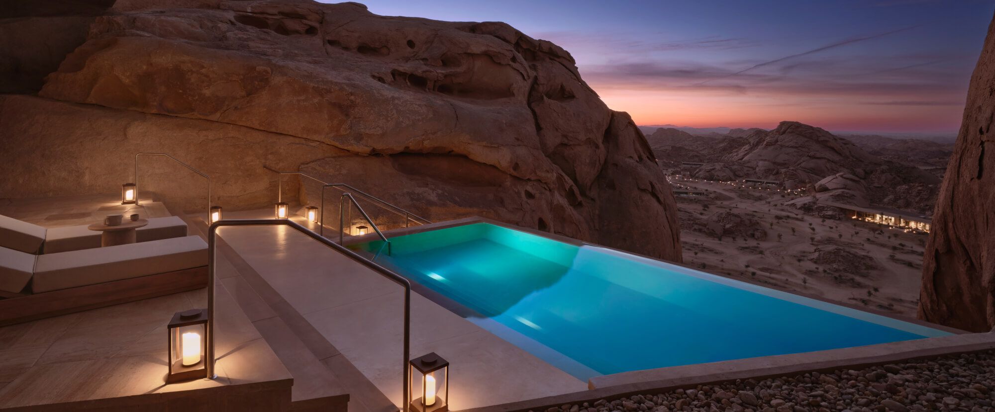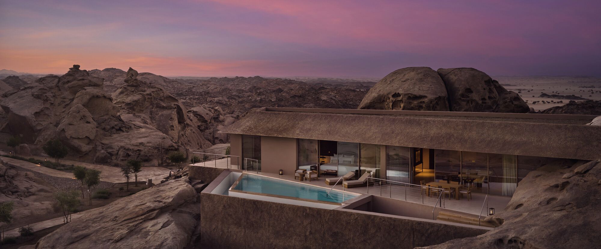 運営は Red Sea Global、設計は米国の Oppenheim Architecture による建築監修で、自然の岩盤を生かしたデザインが魅力です。このリゾートは、「山と砂漠が出会う場所で、ヴィラが古代岩床の中に溶け込む」というコンセプトが掲げられています。