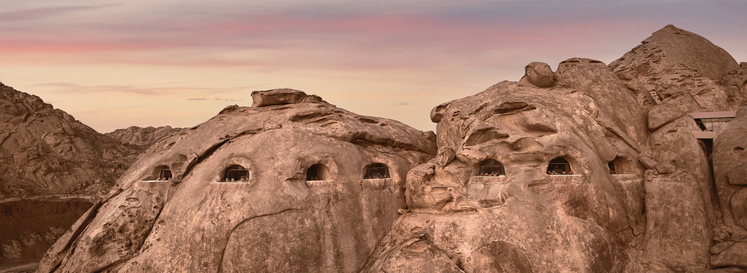 マッシーフの岩肌と一体化するように造られたデザート・ロックの「マウンテンケーブ・スイート」は、他では味わえない特別な滞在を演出する。