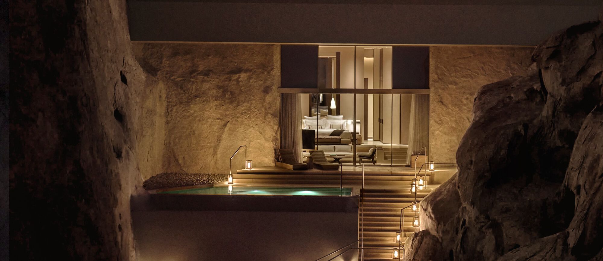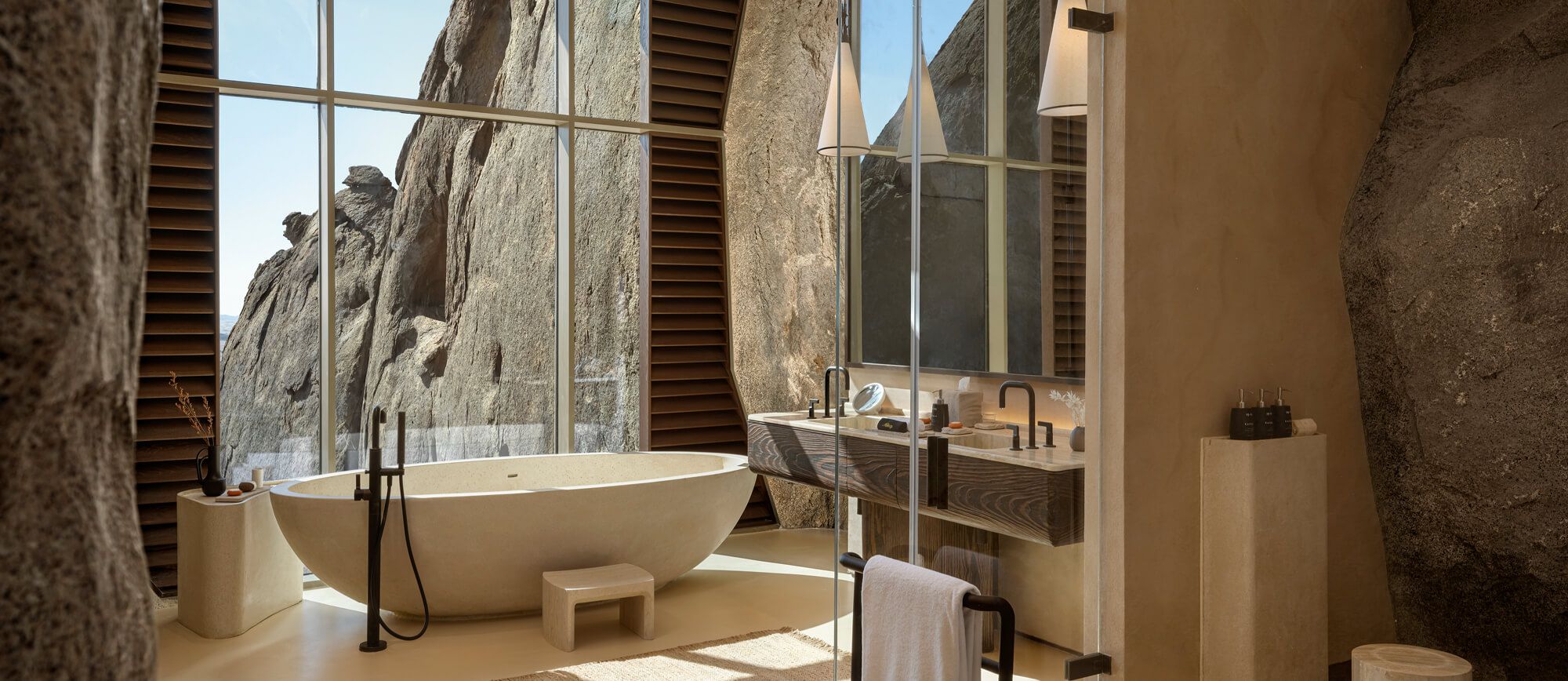 建物が周囲の5百万年の花崗岩の谷間に溶け込むように設計されており、従来の高級リゾートとは一線を画す“地形そのものを宿泊施設に変える”アプローチが取られています。