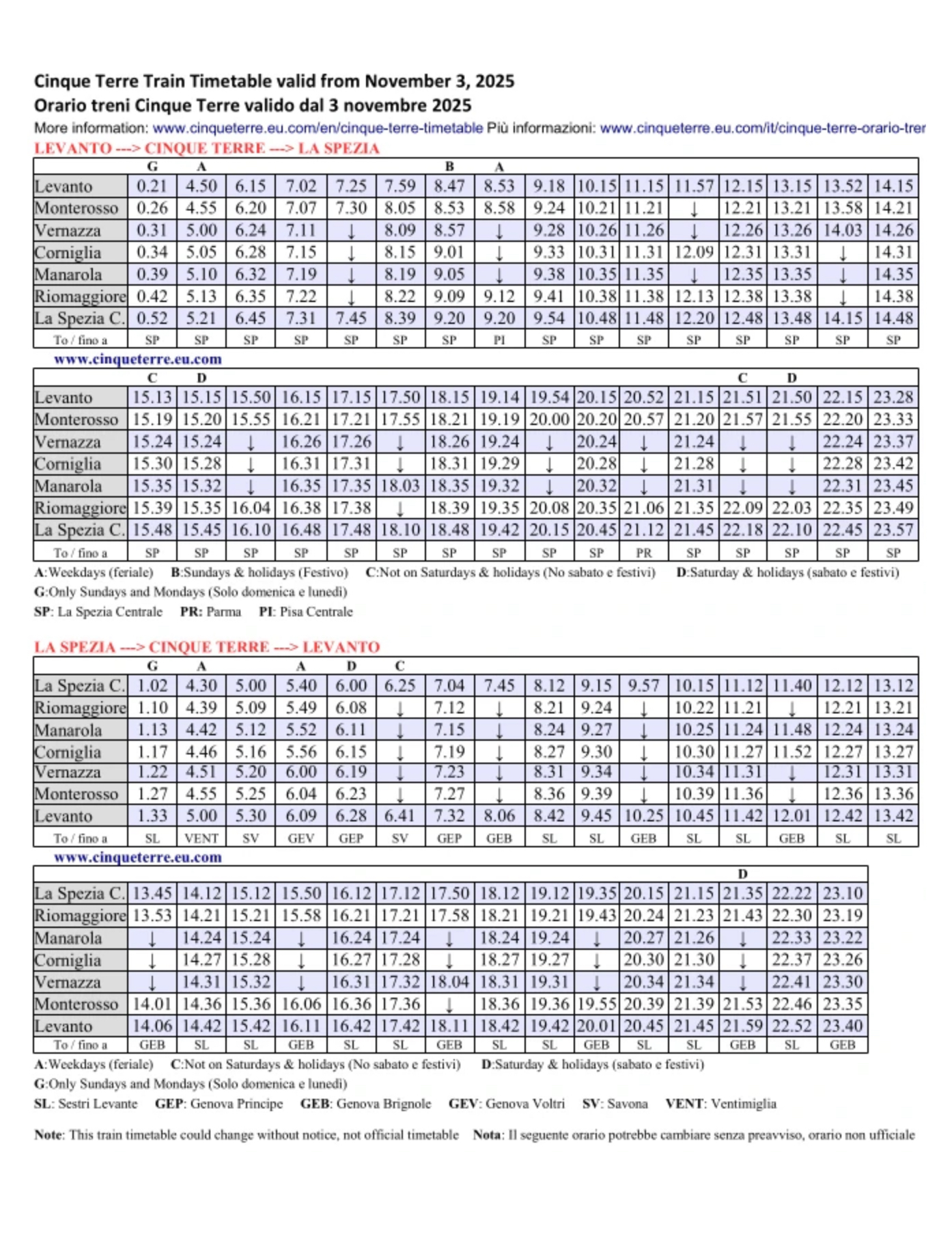 ・主要都市(ミラノ/ジェノヴァ/フィレンツェ/ピサ)などから、まずは鉄道でラ・スペツィア(La Spezia)へ。そこからローカル列車(“チンクエ・テッレ・エクスプレス”)で各村へアクセスできます。